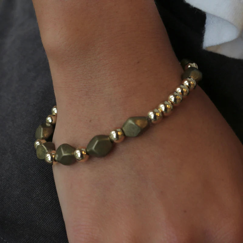 This easy to wear stretch bracelet features brass and gold beads. Its fun to wear alone or in a great mixed metal stack.