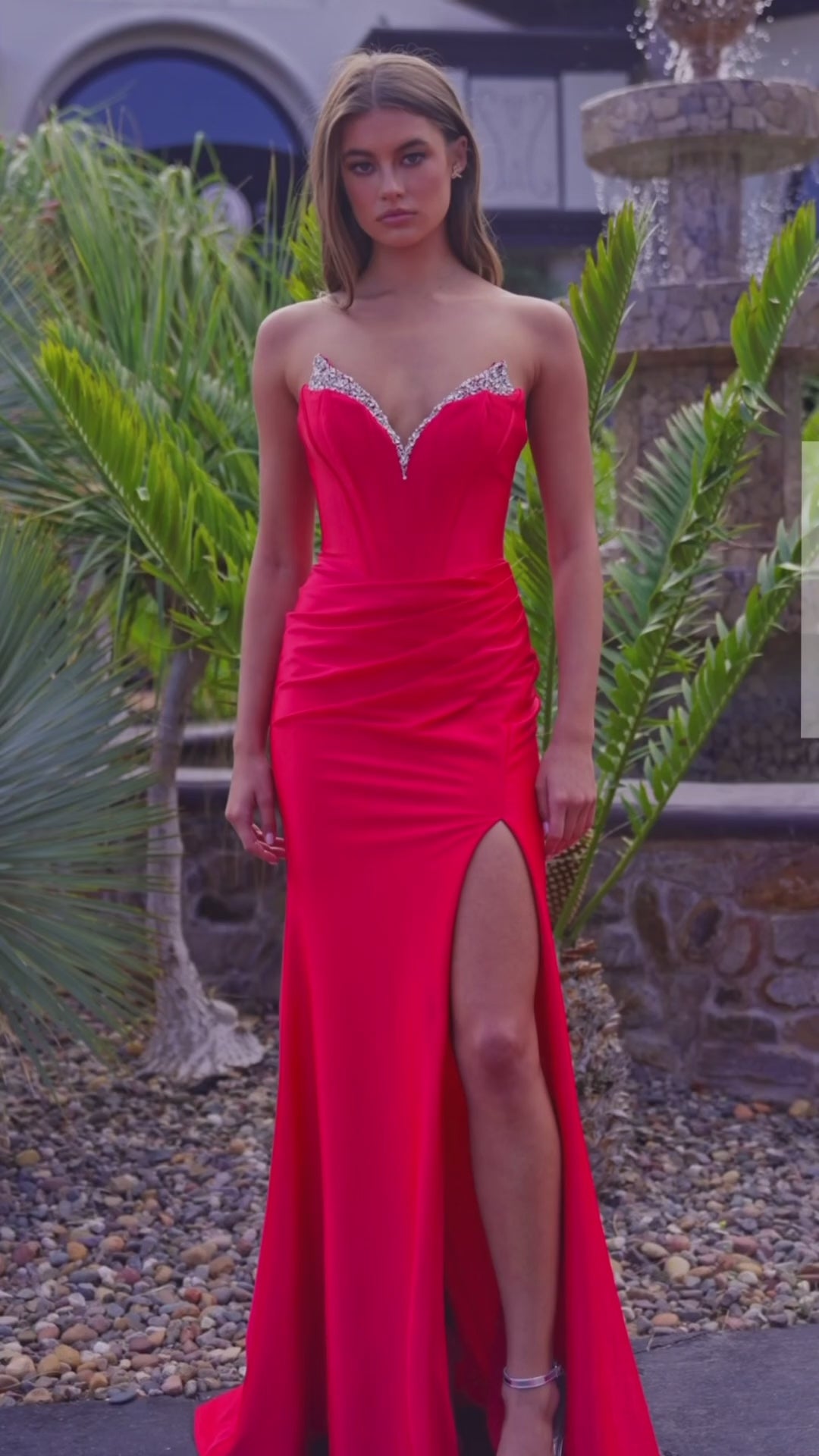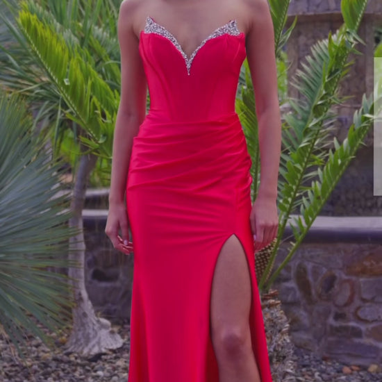 Make an entrance that shimmers with confidence in this sleek shiny satin gown. The strapless plunging V-neckline, edged in delicate beadwork, adds just the right touch of sparkle, while the boned waistline sculpts and defines your shape beautifully. A high slit brings bold, modern drama, and the sweeping train trails behind you with effortless elegance. This is glamour—elevated.