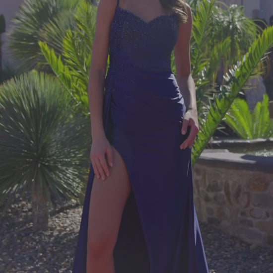 Turn every step into a moment in this sleek shiny satin gown, designed with a flattering V-neckline and delicate spaghetti straps for a timeless, feminine look. A striking beaded appliqué cascades from the bust down to the right hip, creating a sculpted, eye-catching silhouette. The elegant side sash adds a soft, flowing touch, while the sweeping train trails behind you with effortless drama. This gown is the perfect blend of modern glamour and refined sophistication.