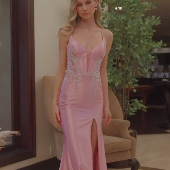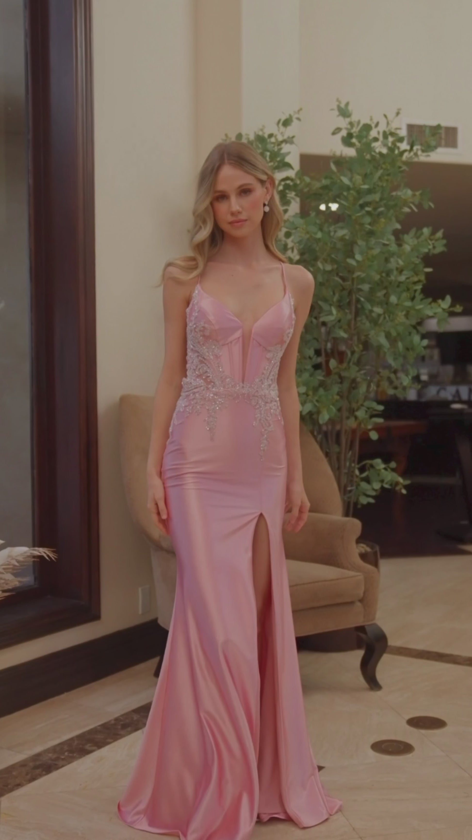 Make a dazzling entrance in this sleek shiny satin gown, crafted with a bold plunging V-neckline and delicate spaghetti straps for a flawless, feminine silhouette. The bodice is adorned with a radiant beaded and sequined appliqué that trails along the side and back, adding show-stopping sparkle from every angle. A sheer boned waistline sculpts the figure with modern elegance, while the high slit brings confident, runway-worthy drama. This gown is pure glamour—elevated.