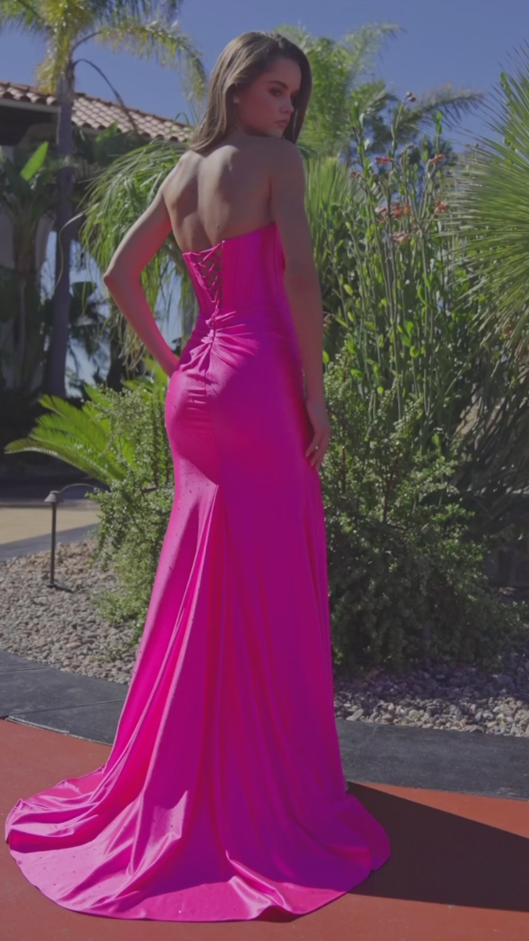 This strapless long gown is crafted from shiny satin for a sleek, glamorous finish. Designed with a bow-inspired bustline and an illusion keyhole detail, it features a structured boned waistline fully adorned with sparkling hot-press stones. A dramatic high slit and lace-up back add modern allure, while a sweeping train completes this show-stopping look.