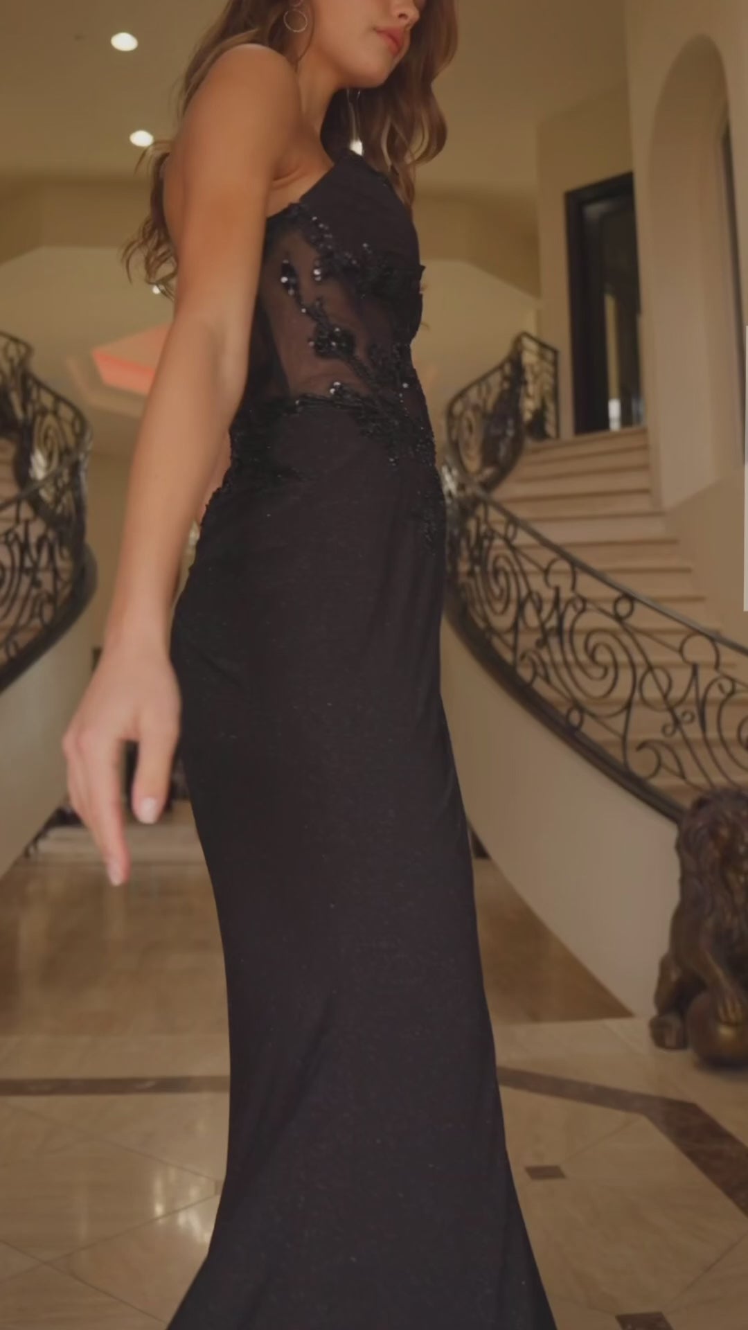Turn heads in this stunning strapless fitted gown, crafted from luminous shimmer jersey that hugs your curves with effortless elegance. The illusion boned bodice features a peaked sweetheart neckline, beautifully accented with woven sequins that add radiant texture and sparkle. A lace-up back ensures a perfectly customized, sculpted fit, while the skirt flows into a bold thigh-high slit for confident, modern drama. This gown is the perfect blend of glamour, structure, and show-stopping style.