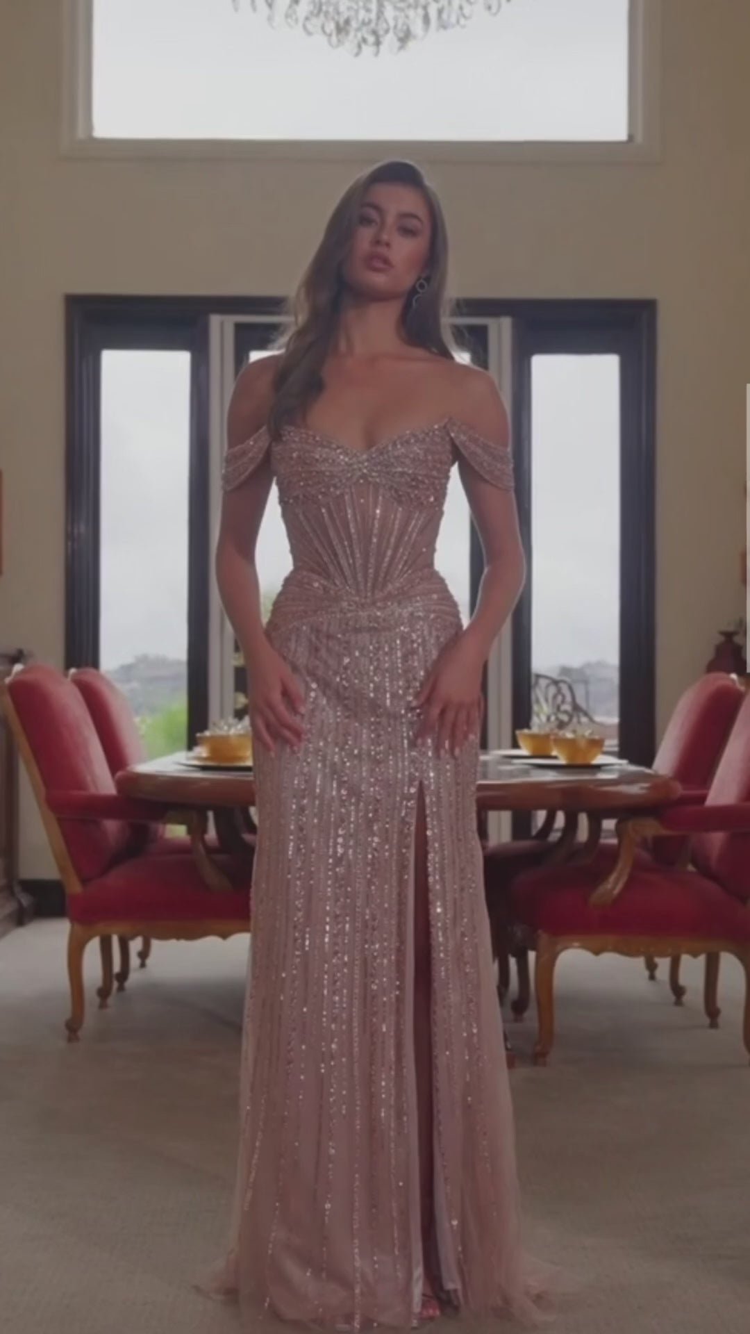 Step into shimmering sophistication with this breathtaking tulle gown, fully adorned with sequin and beaded appliqué for head-to-toe sparkle. The elegant V-neckline and matching V-back create a stunning, elongated silhouette, while the detachable off-the-shoulder straps let you switch effortlessly between classic and romantic looks. A sheer waistline adds modern, sculpted detail, and the high slit brings bold, confident movement. Finished with a sweeping train, this gown promises unforgettable glamour from every angle.