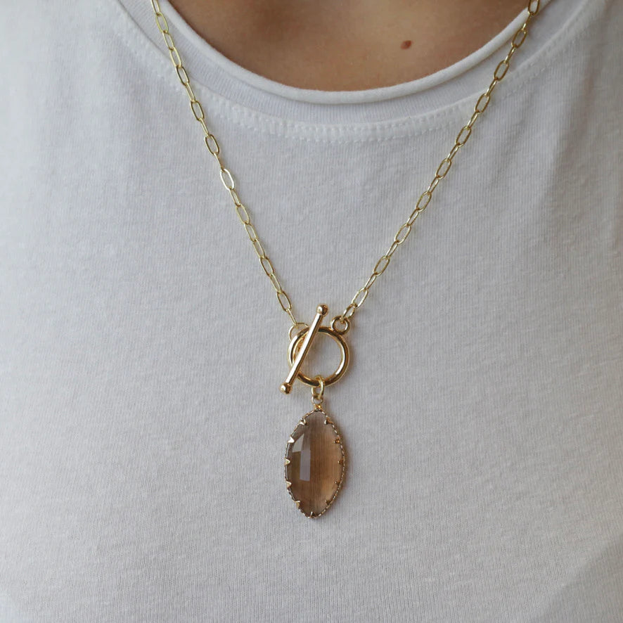 We love a toggle style necklace and are obsessed with the smoke quartz glass crystal or rustic brass coin that this necklace features.