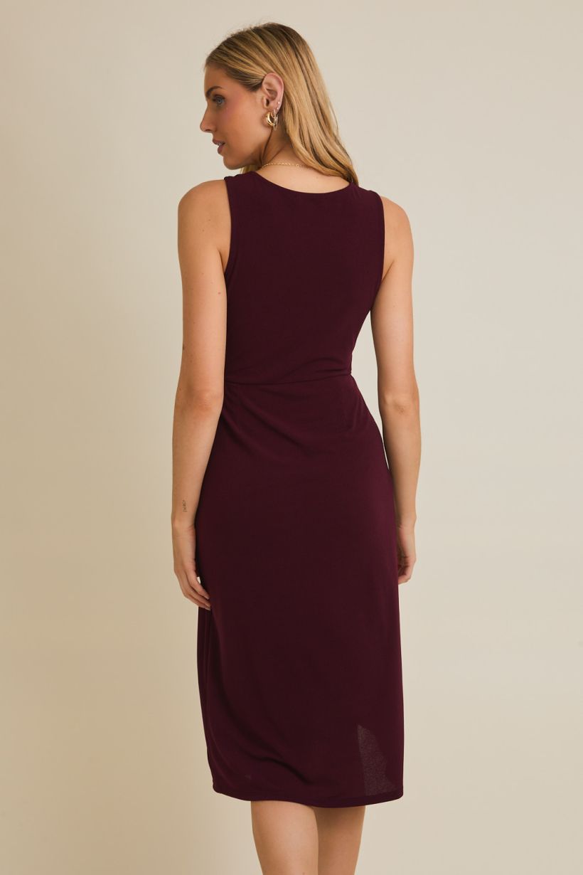 Effortlessly refined with a modern twist, this sleeveless dress is a go-to for any occasion that calls for a little polish. The rich wine hue brings instant sophistication, while the subtle front knot detail creates graceful draping that flatters in all the right places. A high neckline and asymmetrical hem add just enough edge to this timeless silhouette. Dress it up with heels and gold accents, or keep it understated and chic—either way, you're golden.